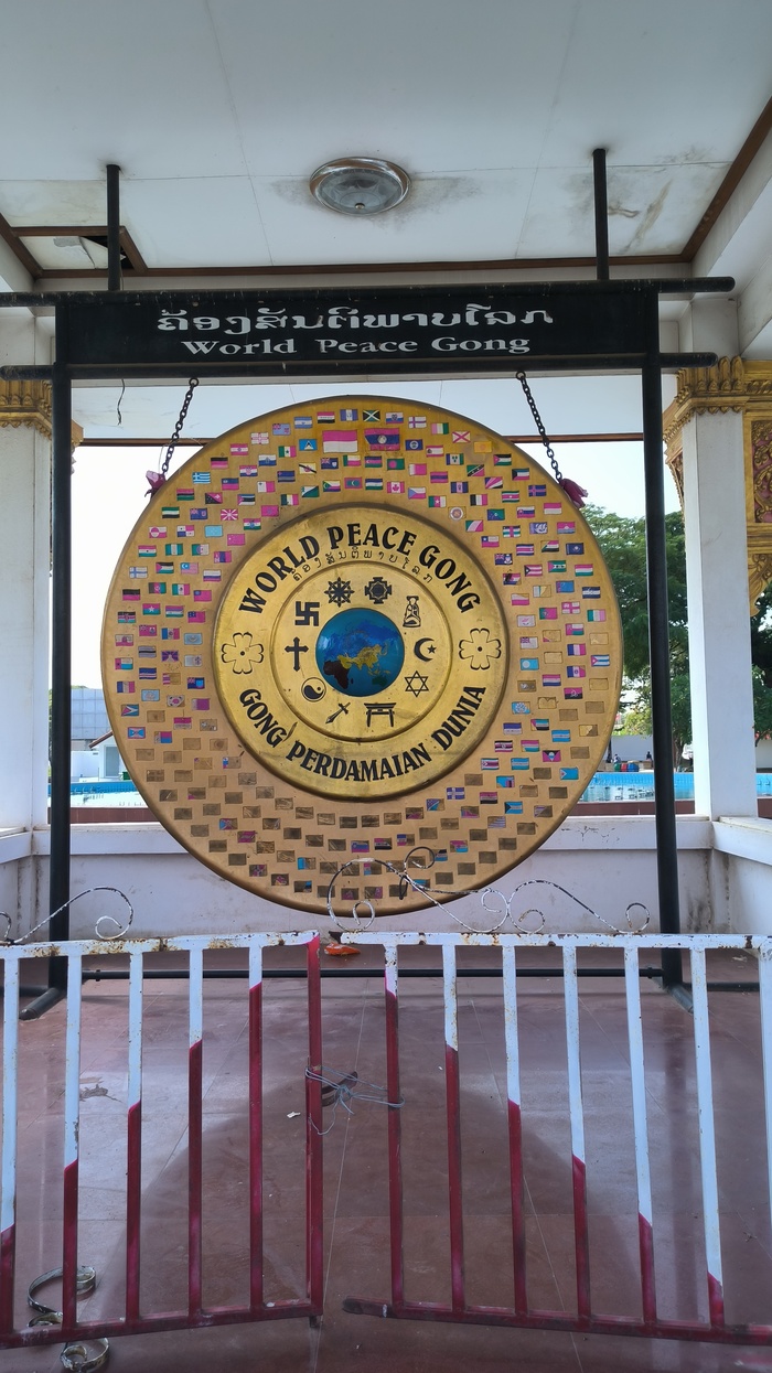 Посмотрели арку, затем дошли до "Гонга Мира". Он прям в плачевном состоянии, вокруг бутылки...