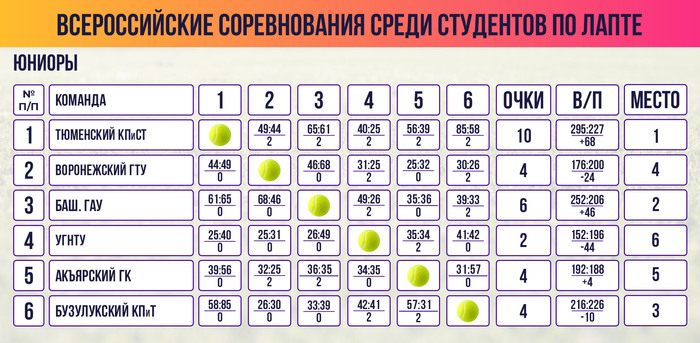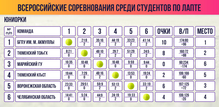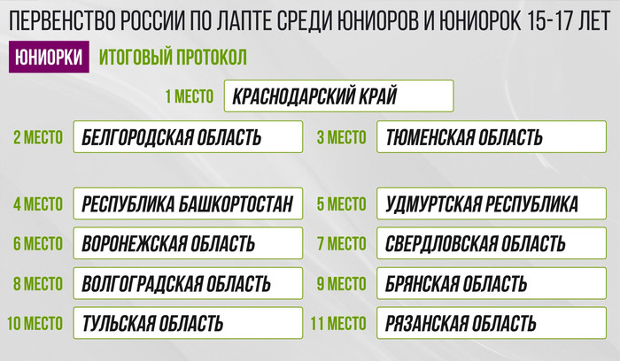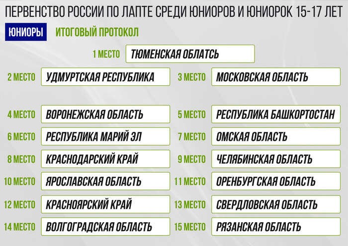25 октября, Волжский. Победу в первенстве России по лапте среди юниоров и юниорок 15–17 лет одержали сборные Тюменской области и Краснодарского края, сообщила пресс-служба Федерации русской лапты России.