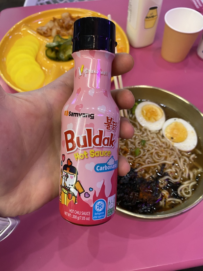 Лапша упругая, толстоватая, вкусная. Бульон мне показался не насыщенный, пустоватый чтоли, поэтому бахнул в порцию нормально так соуса булдак карбонара, его кстати можно взять бесплатно и добавлять к себе в порцию.