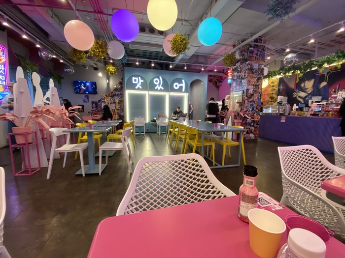 На входе сразу встретили, уточнили в зале или с собой, скинув куртку на вешалку, занял свое место. Все очень чисто, приветливо, дружелюбно, играют корейские поп айдолы, в общем антураж веселый.
