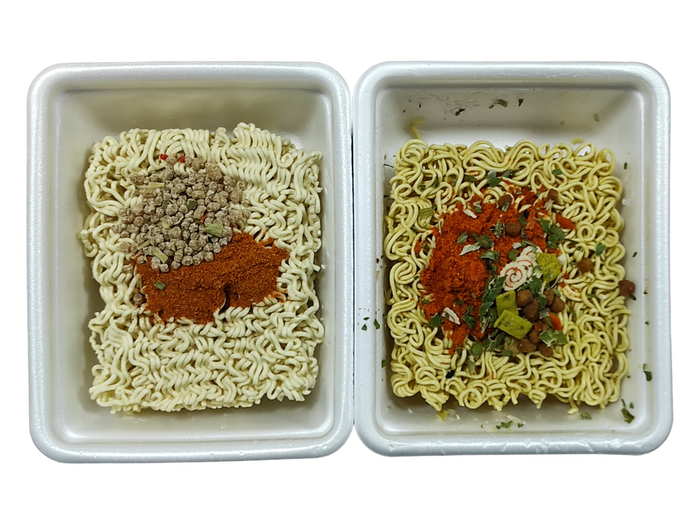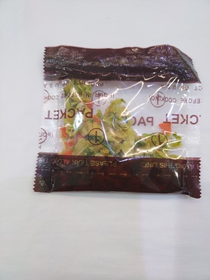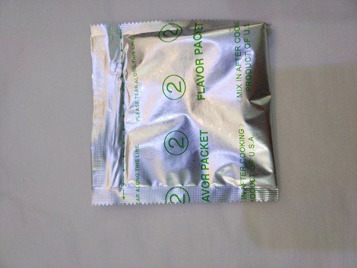 Вскрываем пакетики с добавками. Закрадываются сомнения. В пакете с бульон-приправой (та, что в серебристом пакете) слишком бледный перец. Но, опять же, это если рядом оригинал, либо у тебя фотографическая память и ты различаешь все оттенки. Высыпаем второй пакет.