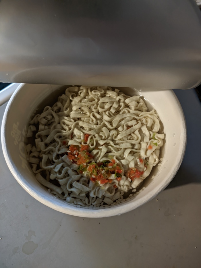 Внутри оказалось 2 пакетика. В одном зелень, морковь, а в другом суповая основа. Приготовил согласно инструкции: залил кипятком, а после 4 минуты в микроволновке. На вкус слегка сладковата, остроты замечено не было. Лапша в меру упругая.