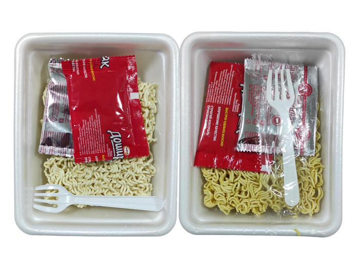 Вскрываем упаковку. Здесь уже интереснее, хотя не особо бдительные граждане пока не заподозрят подвоха. Единственное, что может смутить - вилочка не в пакете. Кстати на вилке из левого Доширака нет фирменного клейма, да и сама она немного жиже оригинала, хотя форма совпадает. Но, опять же, не только лишь все вспомнят - в пакете она бывает, без пакета. Вот сама лапша заметно отличается - гораздо бледнее, чем должна быть.