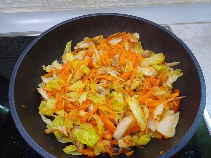Добавила капусту, перемешала. Прожарила ее минутку.