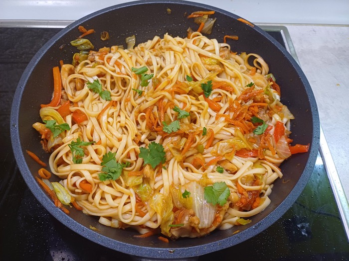 Добавила отварную лапшу и хорошенька перемешала, выключила плиту, посыпала рубленой кинзой . Разложила по тарелкам.