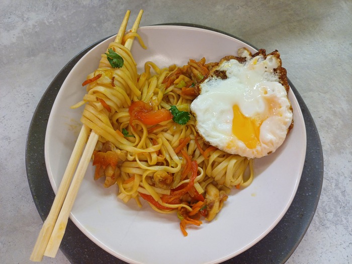 Ещё можно быстренько поджарить одно яйцо и добавить к лапше.