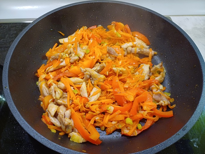 В сковороду налила немного растительного масло, прогрела его и обжарила курицу на сильном огне (у меня регулятор до 9, готовила на 8), постоянно помешивая, в течение пары минут. Следом, отправила в сковороду лук и морковь. Перемешала, обжарила минуту, в процессе регулярного помешивания добавила перец. Всё вместе обжарила еще минуту - две.