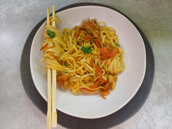 Решила приготовить сама. Но тут я сильно заморачиваться особо не стала - самой готовить лапшу и соус. Сами понимаете, праздники и всё такое. Получается ленивый рецепт, для тех, кто хочет по-быстрому удовлетворить свою потребность.