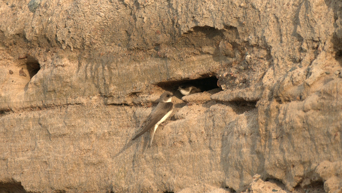 Зачем же этим птицам столь странное занятие? Оказывается, таким образом ласточки прячут свои гнезда! Птицы роют норы на песчаных обрывах, делают они это самостоятельно, причем и самец, и самка. Длина норы может достигать полутора метров. В конце норки имеется небольшое расширение – гнездовая камера, в которой береговушки и устраивают гнездо – из сухой травы и перьев. Оба партнера вместе насиживают яйца и сообща выращивают потомство.