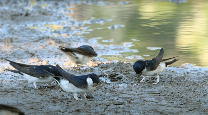 В Петербурге живет три вида ласточек: кроме береговой, еще деревенская и городская. У них, в отличие от береговушки, верх тела иссиня-черный, а низ белый. У деревенской ласточки на лбу и горле каштаново-красное пятно. У городской ласточки, в отличие от деревенской, горло белого цвета и белое пятно на пояснице. Самцы от самок у ласточек внешне не различаются.