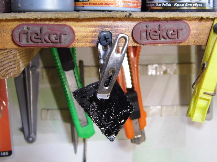 После просушки - термоактивация и приклейка. На этом дело можно было бы и закончить. Но учитывая, что внешний вид был не важен абсолютно, главное - надёжность, мы взяли крючок и прошили по подошве. После уберём остатки клея.