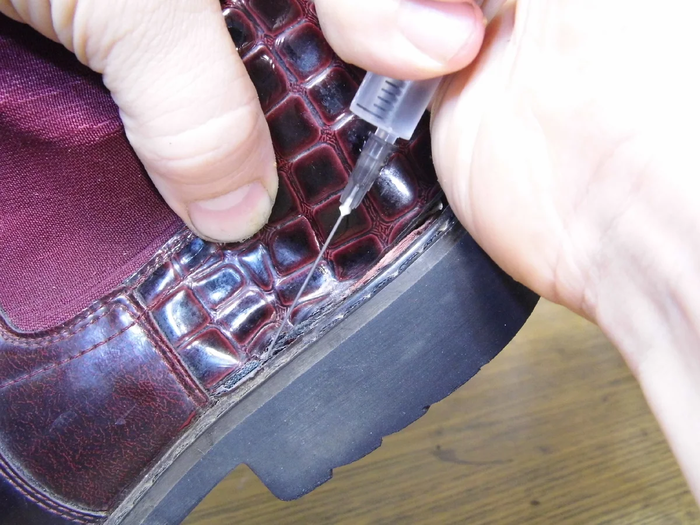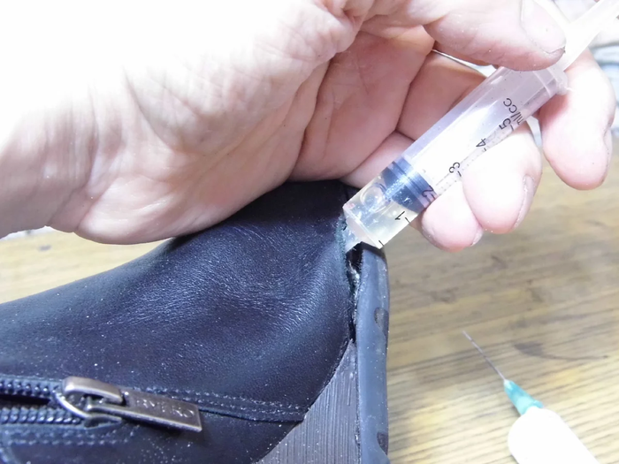 Пока запихнём немного полиуретанового клея между подкладкой и верхом.