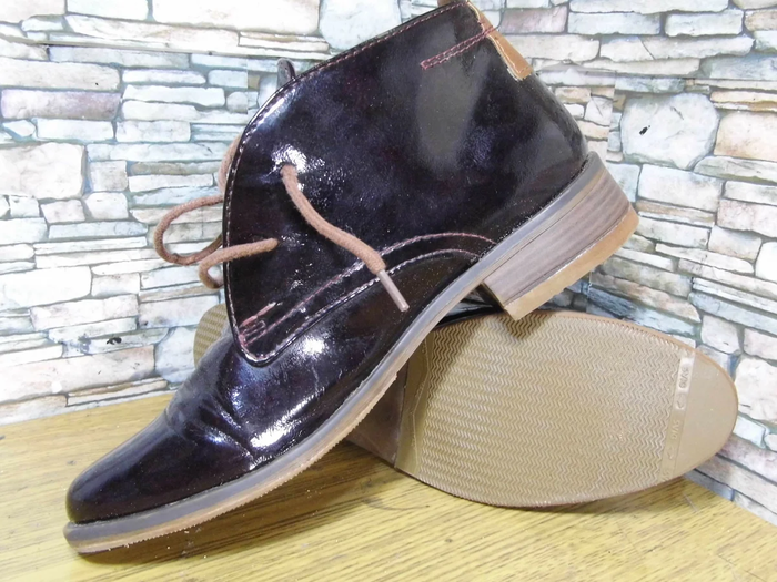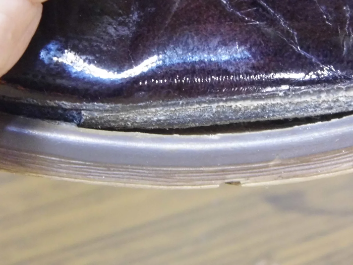 Здесь это случилось в месте сгиба стопы (так называемая пучковая часть). Случилось как-то само собой, по нефти не ходили, бортики не цепляли, со ступенек не соскальзывали. При ближайшем рассмотрении видим, что сам материал верха (кожа) не повреждён. Оторвался именно лаковый слой. Что говорит о надёжности клея. Но от этого не легче.