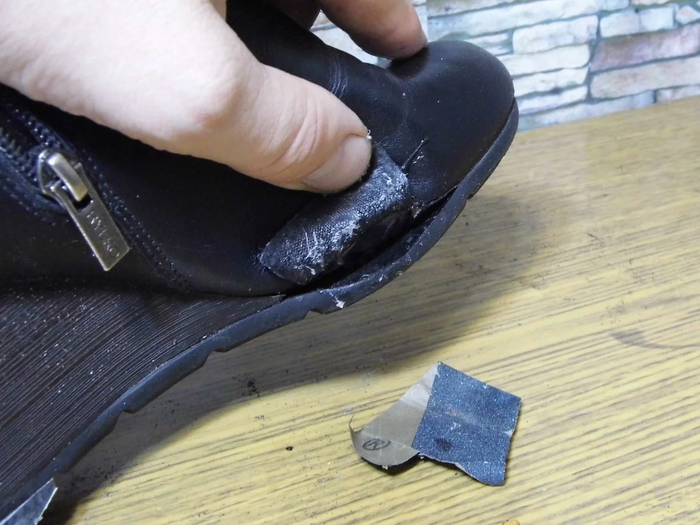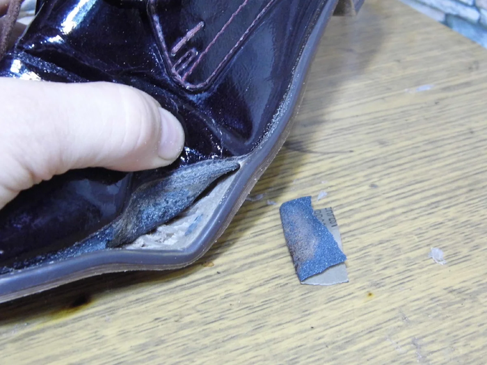 Далее нужно зачистить место приклейки на подошве. Края заправятся между подошвой и основной стелькой.