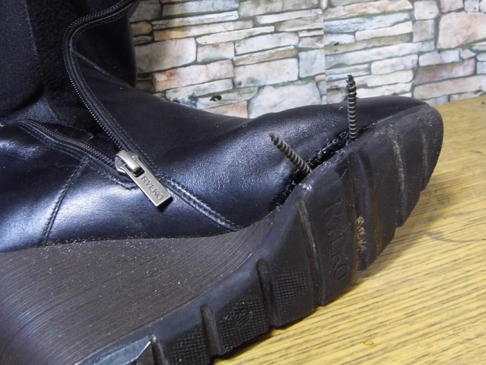 Далее нужно клей просушить. Так как жёсткий задник у нас белого цвета (см. фото в начале статьи), а подошва чёрная, один саморез будет белый, а другой чёрный.