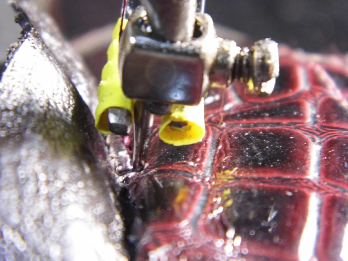 Так как это не натуральный лак, надеваем на лапку машинки трубочки термоусадки. На всякий случай. Прошиваем как можно ближе к краю.