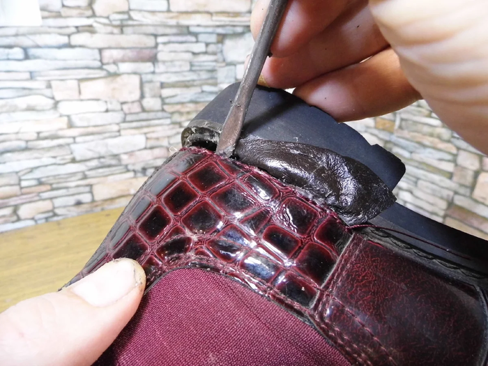 Разбираем. Отвёртка со скруглёнными гранями, этилацетат. Нижнюю часть затяжной кромки отрежем, чтобы не было утолщения под стелькой.