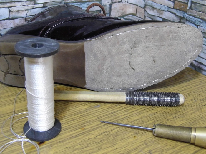 Далее. Как помним, клей держал хорошо. Но всё же разошлось. Чтобы это предотвратить, прошьём переднюю часть обуви по следу. Нам сильно помогло, что набойки и профилактика в этой паре и так были нужны. Применяем наши любимые царапалку и крючок. Нитку берём тонкую - рельеф на поверхности приклейки нам не нужен. Она всё равно достаточно прочна - руками порвать трудно.