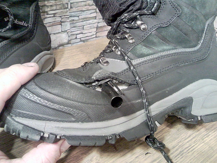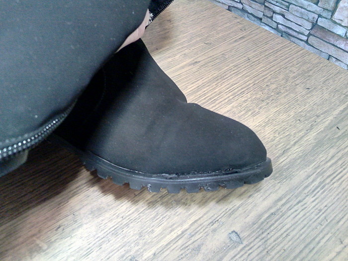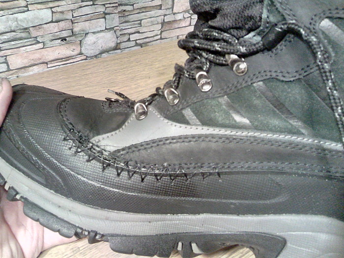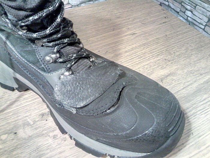 Здесь верх из кожи прикреплён к полимерной осоюзке. Сначала приклеен (вряд ли здесь горячая вулканизация), затем пришит. Порвалась сама осоюзка по этому шву. Единственным пожеланием заказчика было, чтоб не попадал снег, который от тепла ноги тает.