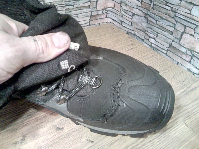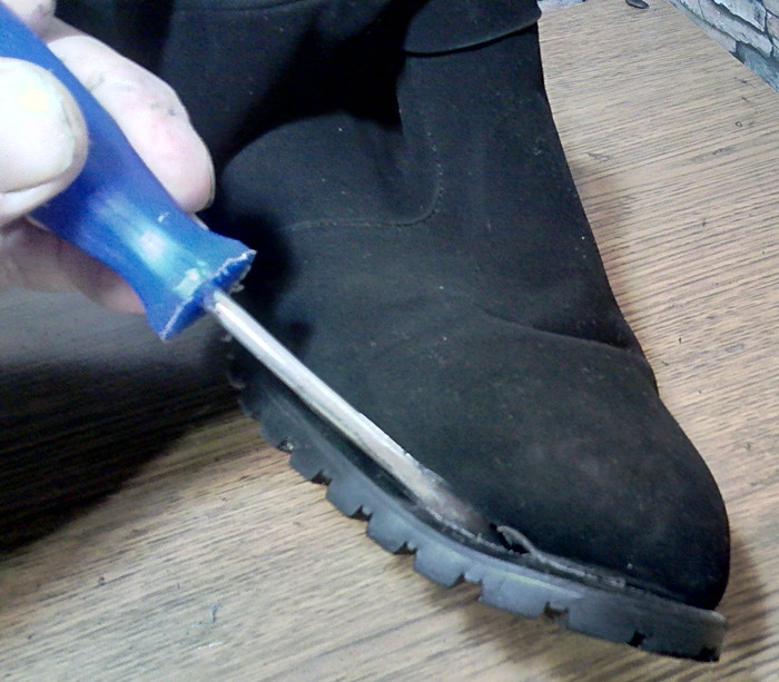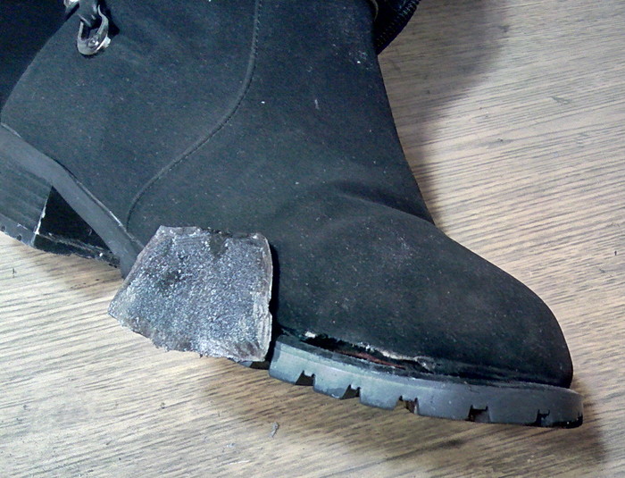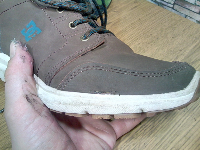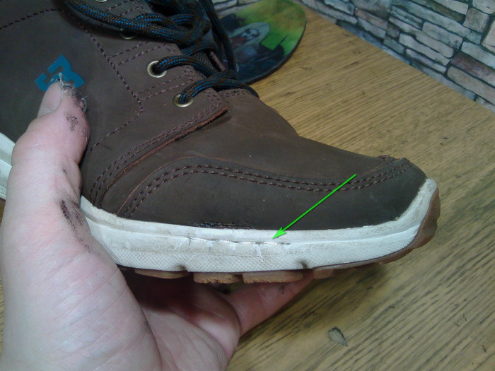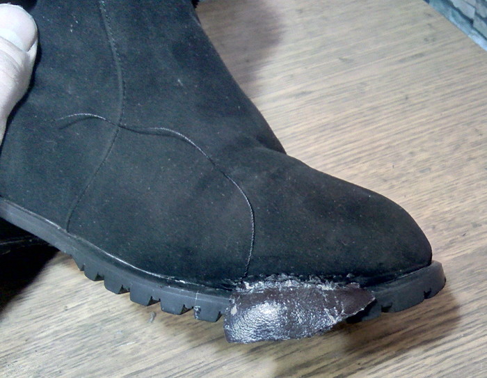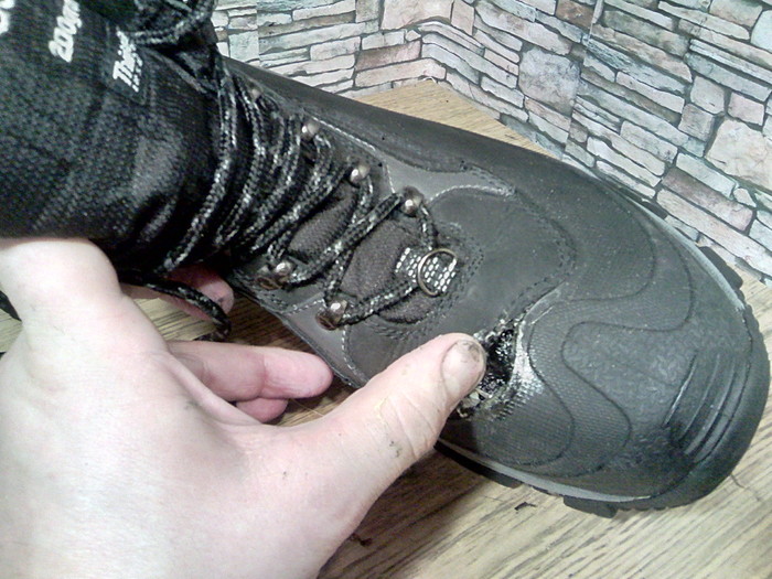 Зима / полузима / то вода, то мороз и прочие сопли... С большой актуальностью встаёт вопрос о всяких повреждениях верха около подошвы. Например, вот: