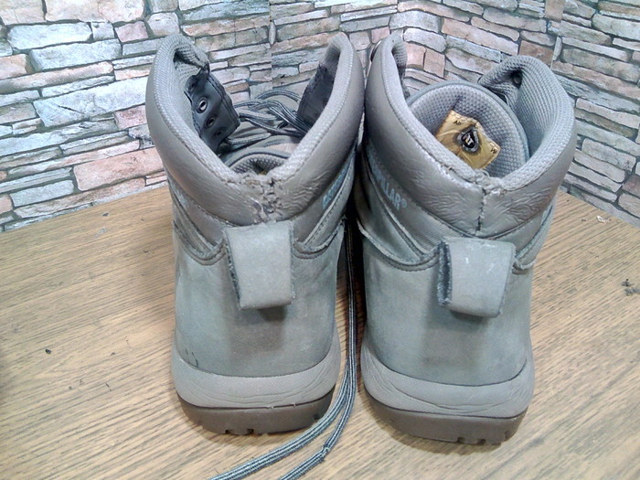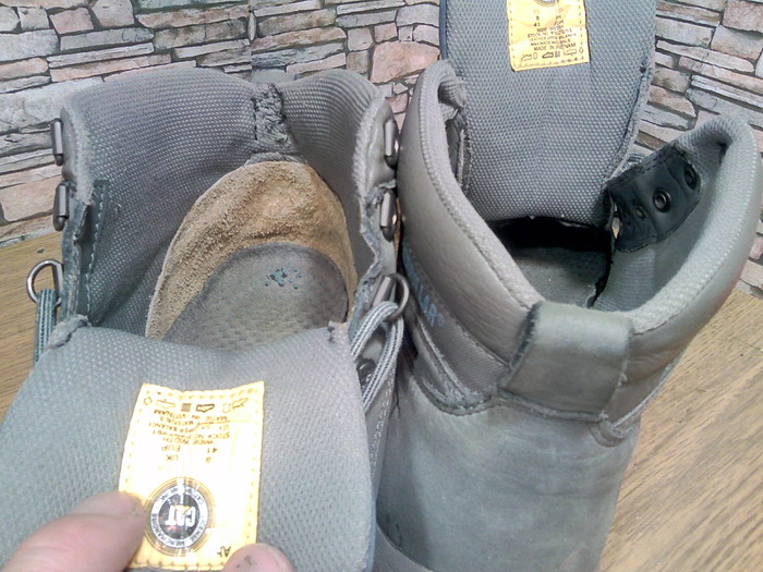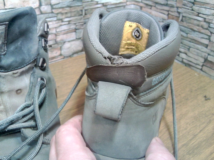 Они собраны очень хорошо. Голубой нубук, всё хорошо прострочено, подогнано, проклеено. На том, что слева на фотографии, белая такая округлость на стельке - это не бутафория, это пружинящая вставка. Зачем, ради какой экономии следовало делать единственную деталь из кожзаменителя - для меня полная загадка (да, я несколько туповат). Ведь если взять менее ответственную деталь, например, тот же берец или язычок - площадь его была бы больше, а шансов повреждения - меньше. Ну да ладно, не наше дело, надо ремонтировать.
