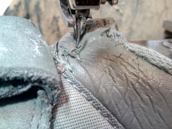 Два слоя полиуретанового клея, клеим, прошиваем к верху. Здесь вот какая дилемма: Шить совсем в край нельзя - игла разобьёт и будет ещё хуже. Шить, так как здесь - заметно, но это если знать, куда смотреть. Это, конечно, оговаривается с заказчиком до ремонта.