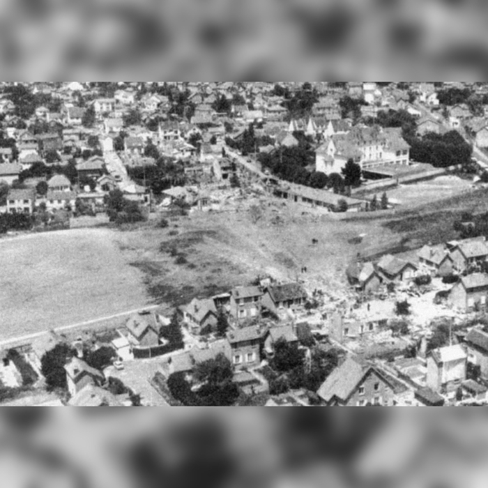 Горящие обломки посыпались на Гуссенвиль как смертоносный дождь. Основная часть фюзеляжа врезалась в жилые дома, оставив воронку глубиной в несколько метров.
