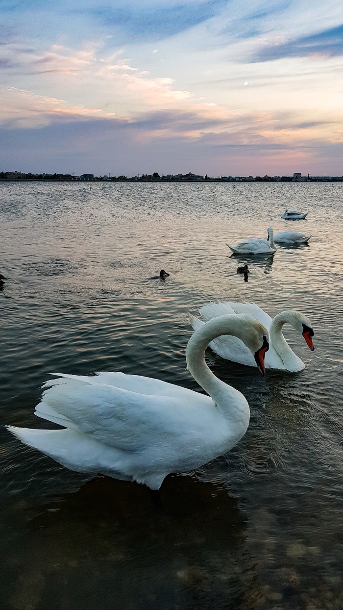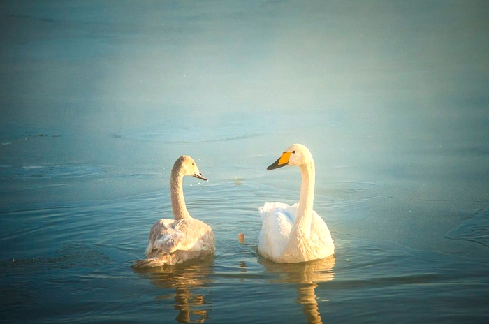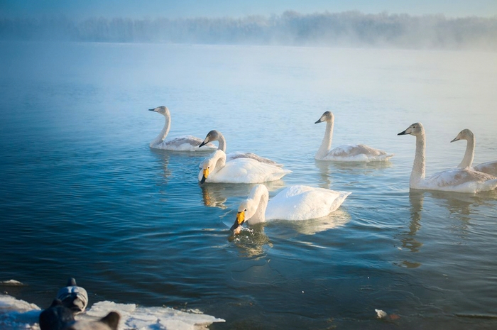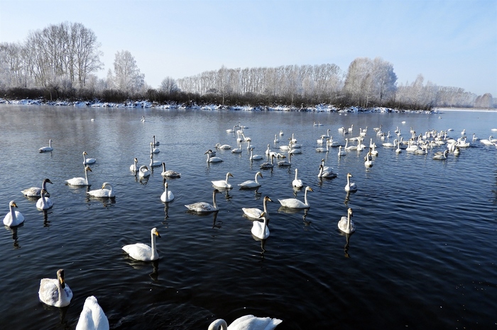 Птицы выбрали мелководное место реки, около моста. Здесь мне удалось насчитать 25 лебедей. Птицы активно кормятся. За лебедями можно наблюдать часами.