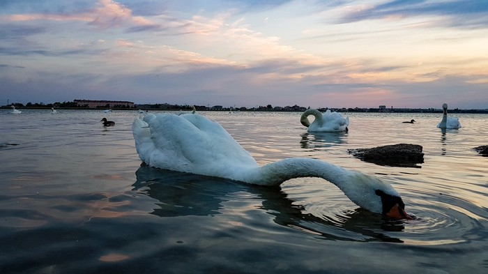 Когда голова лебедя под водой, на поверхности появляется словно перьевая подушка, из которой торчат и ловко подгребают две черные мощные лапы, пытаясь балансировать на довольно сильном течении.