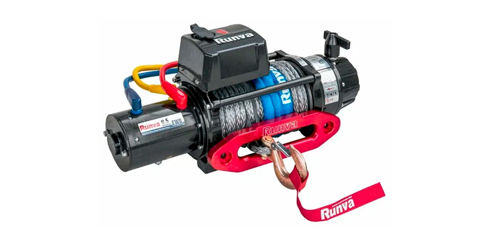 Дальше в рейтинге электрическая лебёдка Runva EWX9500S — мощное решение для внедорожников и спецтехники, рассчитанное на тяговое усилие до 4309 кг (9500 lbs). Модель работает от 12-вольтовой сети и оснащена двигателем постоянного тока с мощностью 5.5 л.с., обеспечивающим стабильную работу в самых жёстких условиях. Лебёдка укомплектована синтетическим тросом длиной 26 метров и диаметром 9.5 мм, что делает её значительно легче аналогов со стальным тросом.