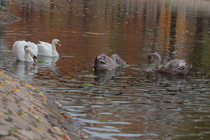 Это пара лебедей-шипунов и двое их малышей, вылупившихся в этом году в Лианозовском парке в Москве. Малыши уже ростом с родителей, но пищат пока ещё как самые что ни на есть птенчики. 🤣