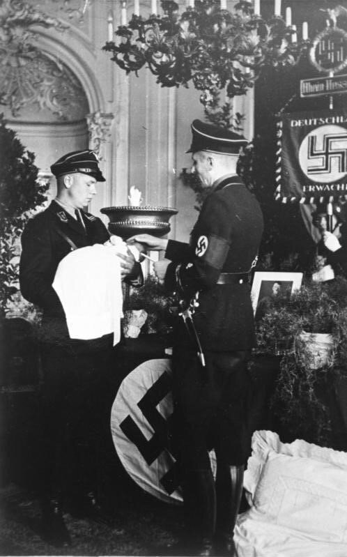 Идеологическая накачка, естественно, тоже была. От имени младенцев приносилась клятва верности Гитлеру, причём это был целый ритуал, достаточно большой и пафосный. В немецкой Википедии (гуглите — Der Lebensborn e. V.) есть очень выразительная фотография этого процесса; приложить её к этому посту я не могу, к сожалению, — закон не позволит. Я категорически осуждаю всю изображённую там символику, но для наглядности фотография очень хороша.