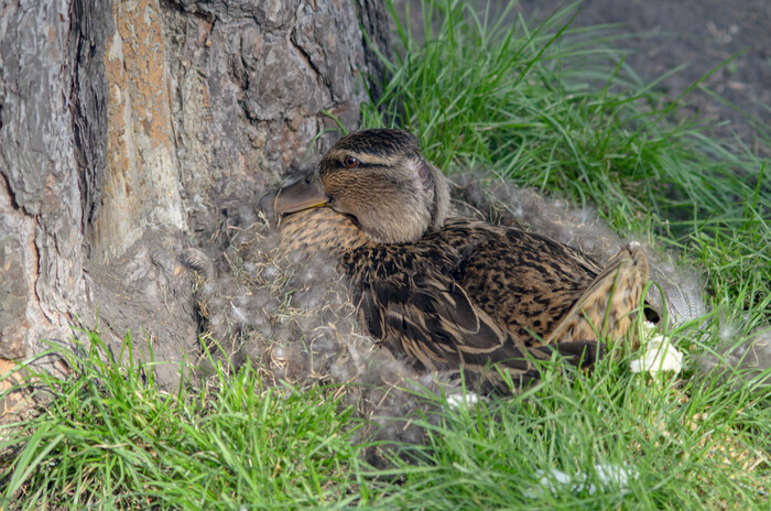 Утка устроила гнездо под деревом, посетители стараются не спугнуть и особо не беспокоить, относятся с пониманием.