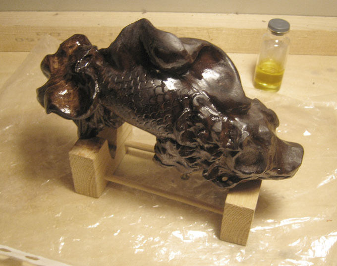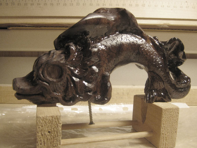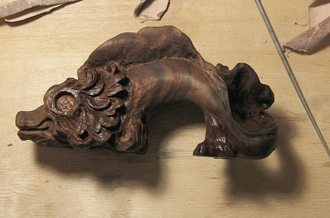 Фикусовые глаза, когда покрыл их на пробу темно-красным лаком, они так мне понравились, что решил оставить. Зрачки сделаны дополнительной каплей лака. Глаза получились довольно живенькие. Стив Шрайвер, американский художник и очень хороший специалист по декору и стилям, был уверен, что они выполнены из стекла. Это был хороший комплимент. :)