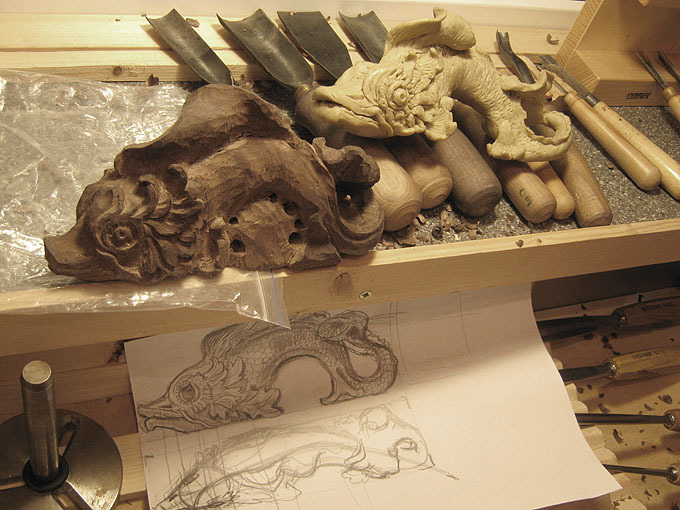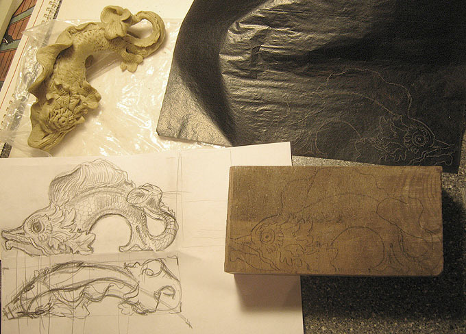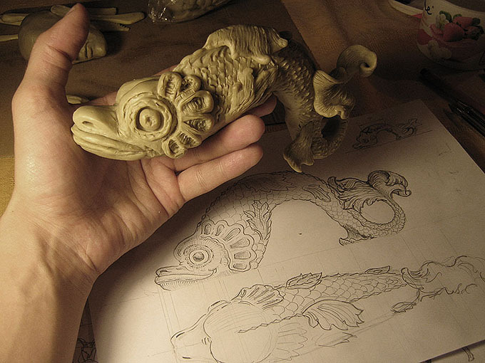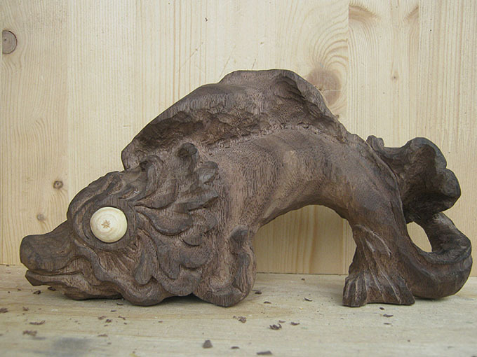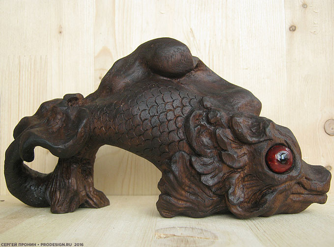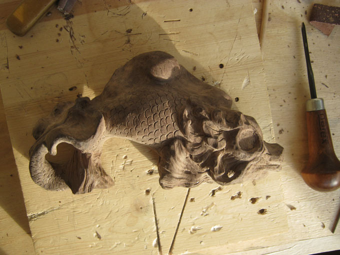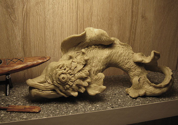 Начал новую штуку. Захотелось воплотить образ в дереве образ старинной рыбы или дельфина, т.е. то, что называлось, проще говоря, как рыба-кит. Нарисовал, слепил (как себе представлял рыбу по памяти). Потом отложилось все месяца на два, за это время приятели одарили меня двумя коробками всяких деревяшек, и я вспомнил про рыбу в шкафу.