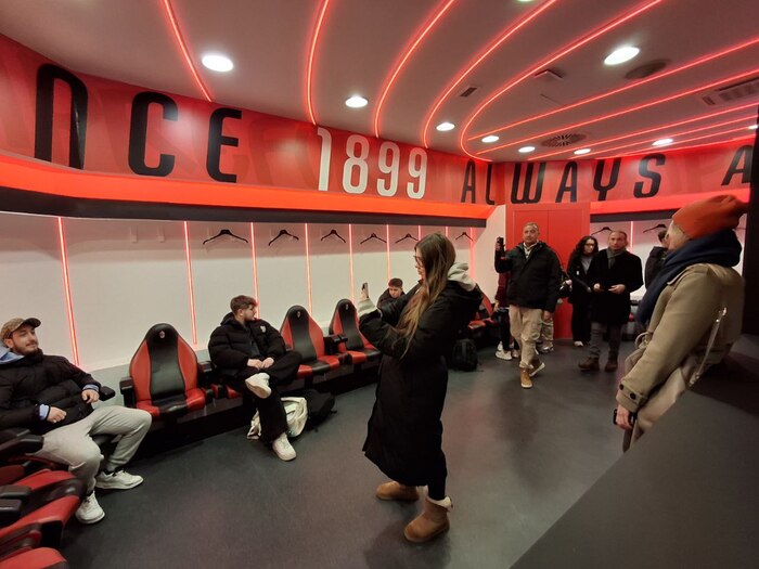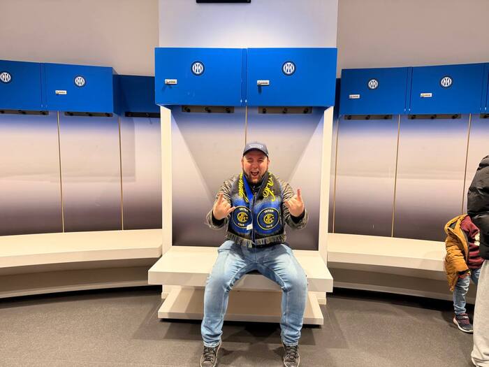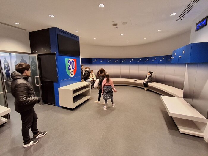 Затем по коридору доходишь до раздевалок клубов. Меня, если честно, очень впечатлила разница между раздевалками «Интера» и «Милана», такое ощущение, что это комнаты любимого и нелюбимого ребёнка (прям как в том анекдоте: «Я одинакого люблю обоих своих котов: Васеньку и того рыжего). Посмотрите сами, в раздевалке «Милана» и кожаные кресла, и куча экранов, и какие-то ништяки типа логотипа клуба на столе, а у «Интера» - деревянные скамейки и ящички с кодовым замком, как в дешёвом спортзале. Ну да ладно, возможно аскетичная атмосфера не даёт расслабиться в перерыве.