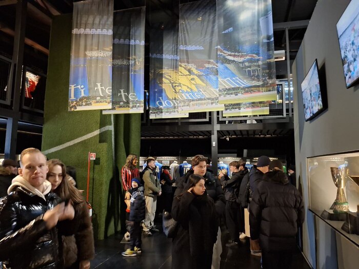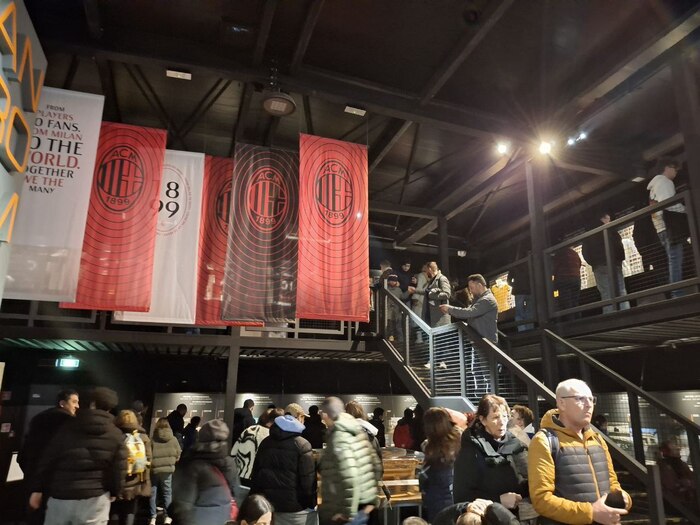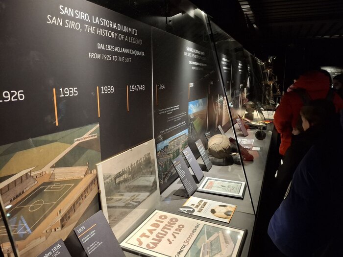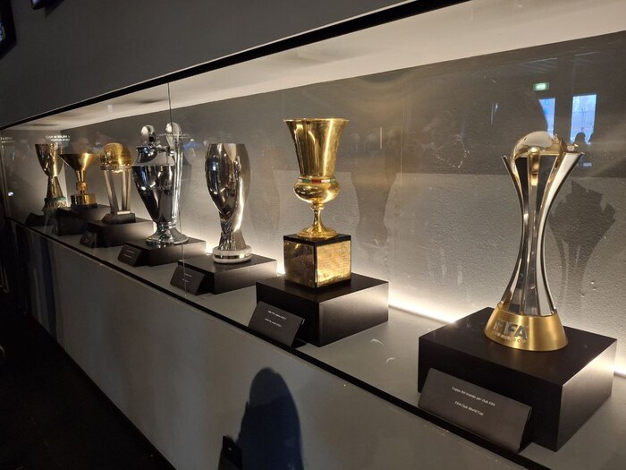 Чтобы попасть на территорию, нужно обойти почти весь стадион и дойти до ворот №14, пройдя которые, попадаешь сразу ко входу в музей, который, если честно, представляет собой весьма грустное зрелище, мне кажется, что музей славы двух суперклубов Италии должен выглядеть как-то по-другому. Внутри всё оказалось ещё печальнее. Здание очень маленькое и даже, несмотря на не очень большое количество людей, там была толкучка. В здании 2 этажа, на первом по центру – выставка кубков (как я понимаю, это всё реплики), которые когда-либо брали клубы, слева коллекция из 10-15 футболок игоров «Интера» и «Милана», выступавших за сборную Италии, справа небольшой стенд с историей строительства «Сан Сиро». Второй этаж разделён между клубами и по сути тоже являтеся простой выставкой футболок известных игроков. Всё это очень скученно, толком ничего не разглядеть из-за тусклого света, да и из-за количества людей. По большому счёту, на этом весь музей и заканчивается.