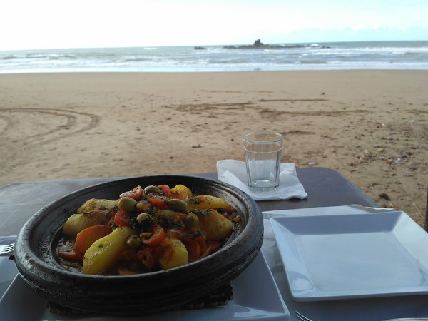 Как раз, пока мы неспешно гуляли до арки и обратно (примерно километр в один конец), чуть меньше, чем за час, в кафе успели приготовить еду. То есть, мы пришли не к финишу ужина, а к его началу. Это такая особенность марокканских кафе: они оооочень неторопливые. Барашка или ципелёнка надо не просто зарэзать, а сперва родить, вылупить из яйца, вырастить и состарить. Так что, пока то да сё, домой вернулись впотьмах.