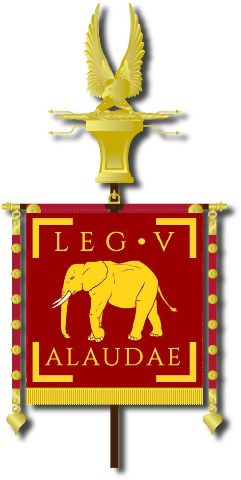Боевая история пятого легиона(Legio V Alaudae), (который первоначально называвлся Gallica) начинается в 52г. до н.э. когда Гай Юлий Цезарь, нуждавшийся в дополнительных воинах, в связи со вспыхнувшим в том же году восстанием вождя арвернов Верцингеторикса, набрал его без одобрения сената из союзных галльских племен. При этом содержал он его за свой счет, жалование солдатам выплачивалось из военной добычи. Сенат скептически относился к галльским союзникам, предполагая, что они либо разбегутся, либо перейдут на сторону врага, однако этого не произошло. Галлы, обученные римской манере ведения боя, храбро сражались против своих соплеменников, и по завершению Галльской кампании, заняли свое законное место среди всех остальных легионов римской республики. Примечательно, что это был первый римский легион, который состоял не из италиков. Два года он был фактически не признанным, и только под самый конец галльских войн, в 50г. до н.э. легион получил признание и перешел на государственное обеспечение. После этого не граждане Рима получили право служить в римской армии.