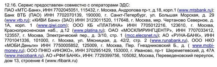 Также снова указано на технологическую неразрывность услуг связи и услуг оплаты и денежных переводов (как до этого Почта России ещё не додумалась?). Однако неразрывность настолько технологическая, что само ПАО МТС не справляется: нужен оператор электронных денежных средств (выделил зелёным). В списке операторов (в оферте сервиса "кошелек МТС деньги") сплошь банки и платежные системы.