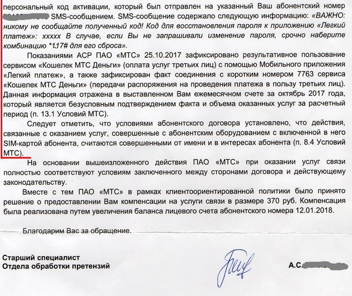 Итак, последним пришло письмо от компании МТС, которого я абсолютно не ждал. В нём сообщается, что я сам несу за всё ответственность, что проведена проверка, что согласно этой проверки я всё сделал сам, и подробно расписано, как я всё это сделал. Но деньги решено вернуть, поскольку МТС клиентоориентированная компания. То, что для осознания своей клиентоориентированности потребовался пинок от Роскомнадзора, не указано (об этом был предыдущий пост).