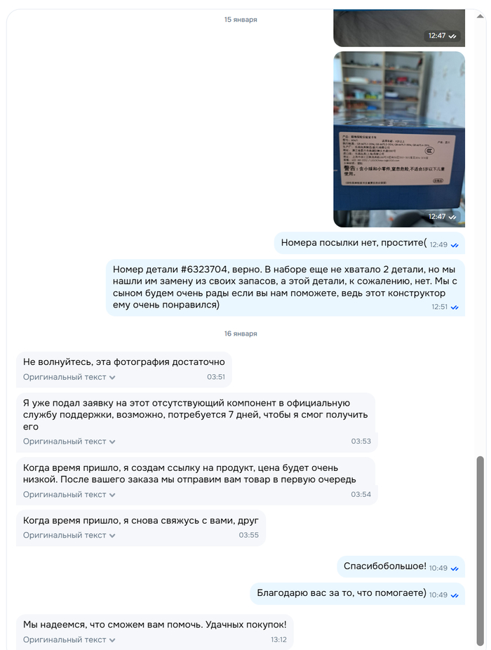 Решили подарить конструктор от бренда iM Master нашему отцу. Долго выбирать не пришлось - выбор пал на робота, похожего на Валли - 8053 с двигателем. Покупали в ТЦ Метрополис, в магазине Мир Кубиков. Привезли к отцу в Бурятию, путь не близкий. Начали распаковывать - незадача, нет инструкции и наклеек. Остались очень расстроены. Возвращаться в Москву не скоро, почти через месяц. Чек остался там же. А без него в поддержке магазина не хотят ничем помогать. Обращаюсь к читателям - может быть у кого-то тоже есть такой конструктор? Не могли бы Вы отправить фото или сканы инструкции? Так бы хоть собрали, а то лежит пылится без дела. Чем смогу - отблагодарю.