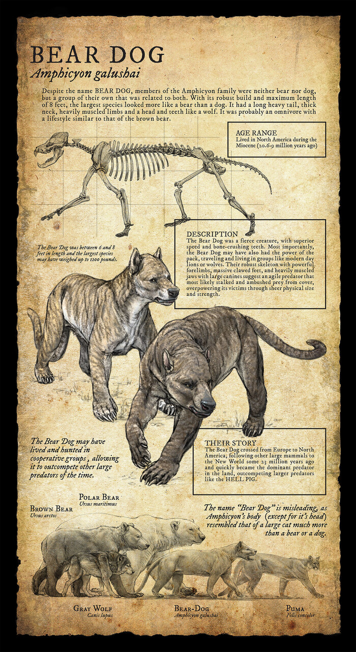 Медвежья собака перебралась из Европы в Северную Америку, следуя за другими крупными млекопитающими в Новый Свет около 23 миллионов лет назад, и быстро стала доминирующим хищником на суше, вытеснив более крупных хищников, таких как АДСКАЯ СВИНЬЯ.