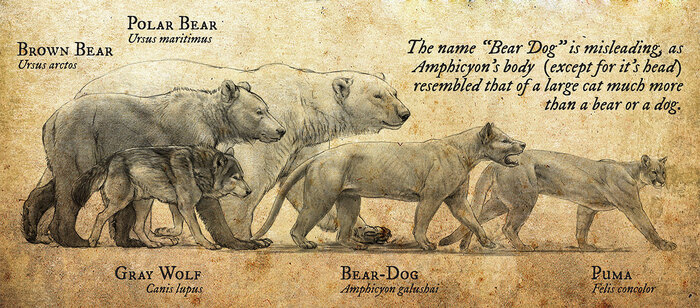 Несмотря на название МЕДВЕЖЬЯ СОБАКА (на англ.BEAR DOG), члены семьи Amphicyon (Медведесобаки) не были ни медведями, ни собаками, а отдельной группой, связанной с обоими. Обладая крепким телосложением и максимальной длиной 2,44 м (8 футов), самый крупный вид больше походил на медведя, чем на собаку. У него был длинный тяжелый хвост, толстая шея, мускулистые конечности, голова и зубы, как у волка. Вероятно, это было всеядное животное, ведущее образ жизни, похожий на образ жизни бурого медведя.