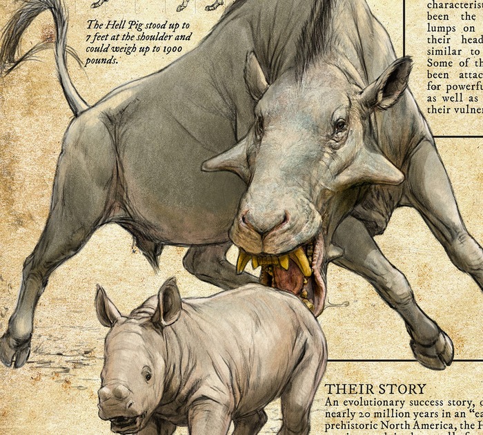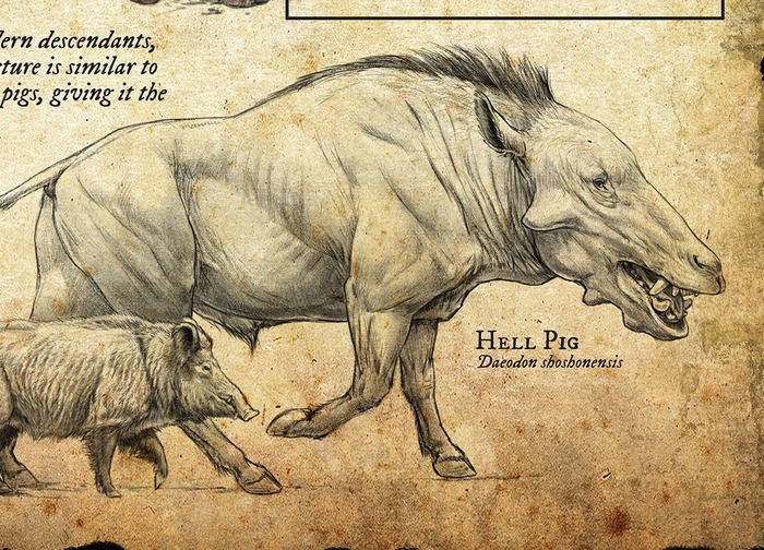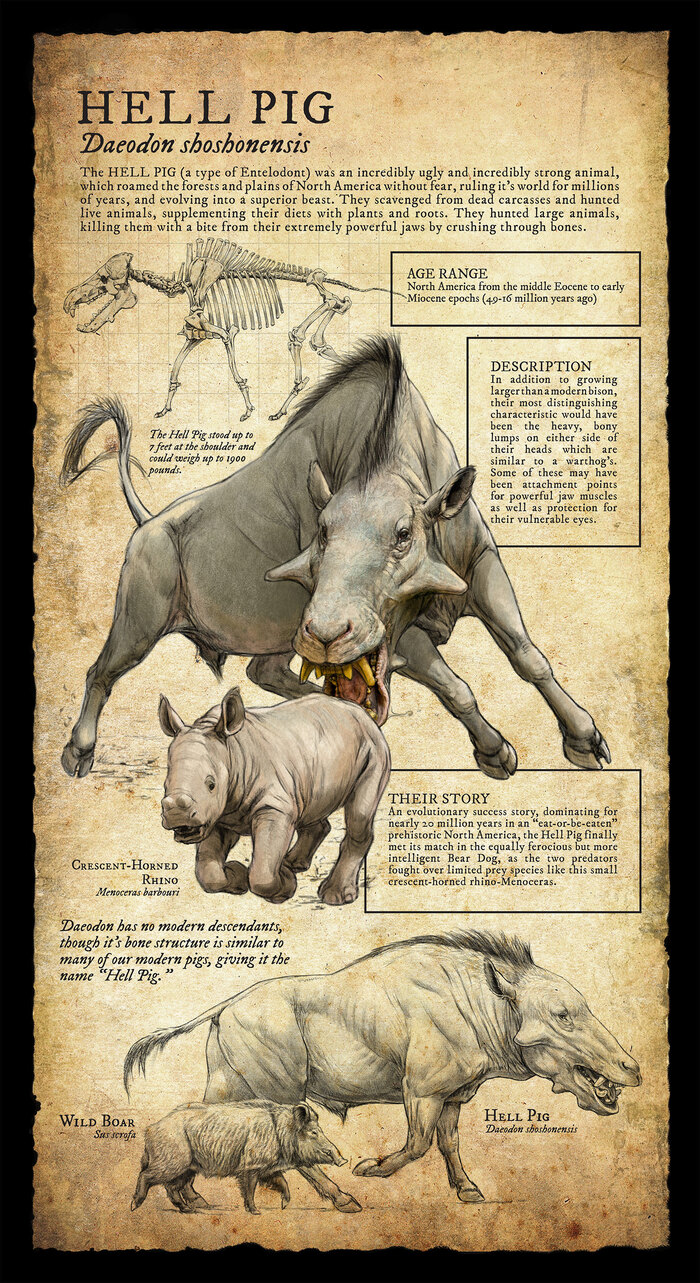 АДСКАЯ СВИНЬЯ (Деодон)(разновидность энтелодонта) была невероятно уродливым и невероятно сильным животным, которое без страха бродило по лесам и равнинам Северной Америки, правя своим миром миллионы лет и эволюционировав в превосходящего зверя. Они питались с мертвых туш и охотились на живых животных, дополняя свой рацион растениями и корнями. Они охотились на крупных животных, убивая их укусом своих чрезвычайно мощных челюстей, проламывая кости.