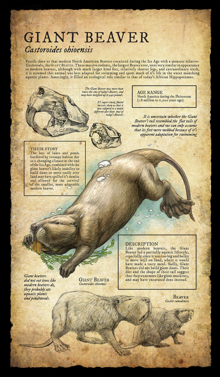 Окаменелости показывают нам, что современные североамериканские бобры сосуществовали во время ледникового периода с их родственниками-монстрами — Castoroides, ГИГАНТСКИМ БОБРОМ. Эти массивные грызуны, самые крупные из когда-либо существовавших бобров, были очень похожи внешне на современных бобров, хотя с гораздо более крупными задними лапами, относительно более короткими ногами и необыкновенными зубами. Предполагается, что это животное лучше всего приспособлено для плавания и проводит большую часть своей жизни в воде, жуя водные растения. Удивительно, но он выполнял экологическую роль, аналогичную сегодняшнему африканскому бегемоту.