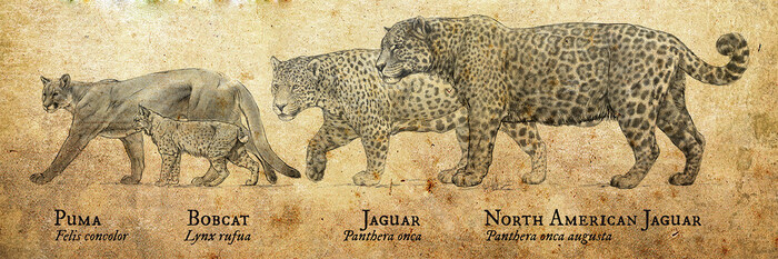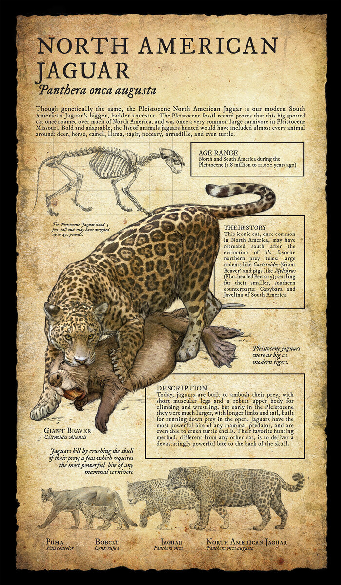 Хотя генетически они одинаковы, плейстоценовый североамериканский ягуар является более крупным предком нашего современного южноамериканского ягуара. Летопись окаменелостей плейстоцена доказывает, что эта большая пятнистая кошка когда-то бродила по большей части Северной Америки и когда-то была очень распространенным крупным хищником в плейстоцене в Миссури. Смелый и легко адаптируемый, список животных, на которых охотились ягуары, включал почти всех животных вокруг: оленя, лошадь, верблюда, ламу, тапира, пекари, броненосца и даже черепаху.