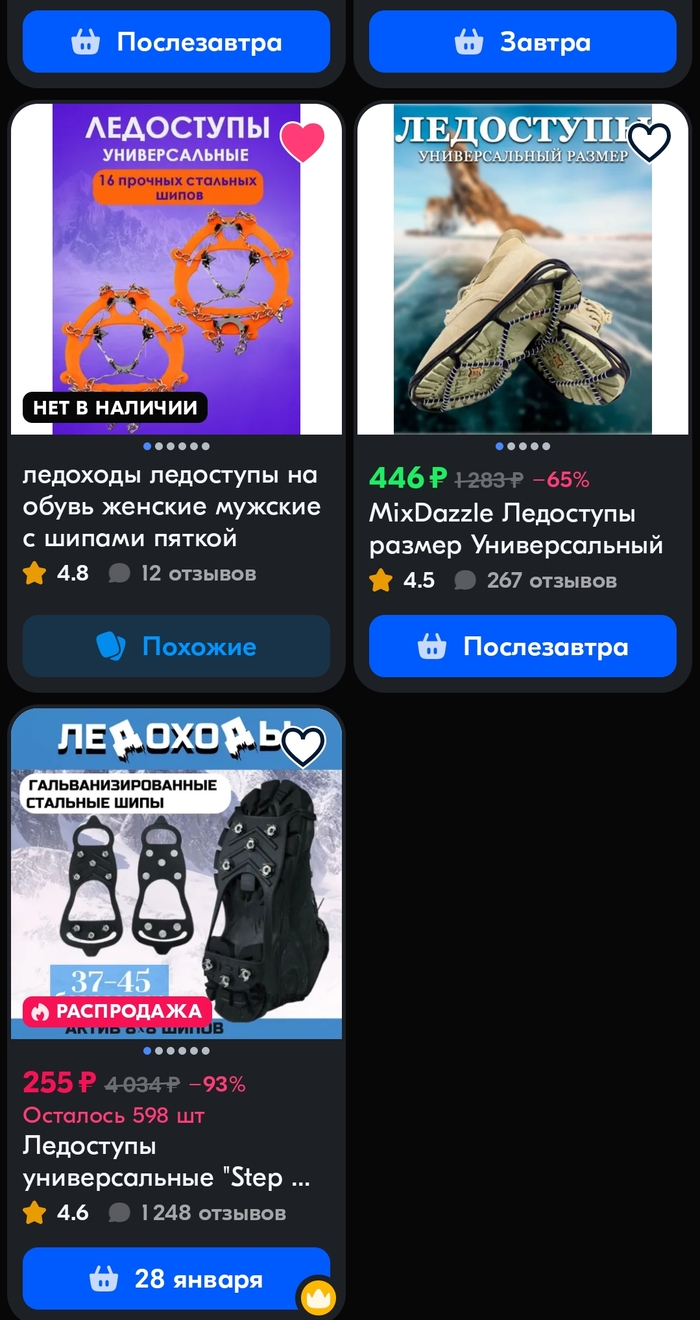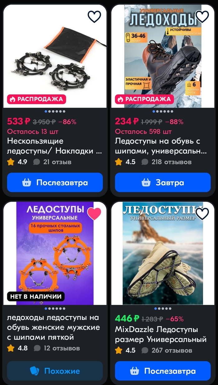 Третий вид. На маркетплейсах они называются альпиниские кошки. Отличная вещь. Ничего не прилипает. Не скользит даже по идеальному льду с водой. Резинки не рвутся, ледоступы не ржавеют. Одевать очень удобно. Снимать тоже. Кроссовки не портят.