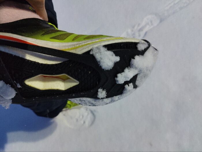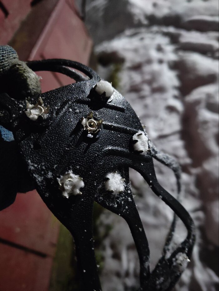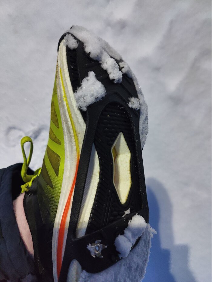 Они сильно прилипают к дороге, снег забивается, получаются ледовые бугорки, снег набивается под резинку. Шипы выпадают. На половине тренировки я их сняла.