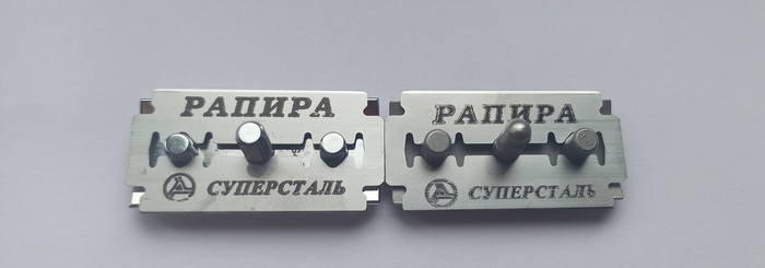 Также, именно Восход/Рапира лучше всего зашли моему племяннику в станке Leaf Razor, не смотря на его мягкость. Поэтому было решено поискать блок этих лезвий прозапас. На рынке цену подняли уже до 80р за пачку, а на популярных торговых площадках цены тоже немаленькие (под 600р за блок). Однако, случайно наткнулся на Рапиру Суперсталь на Али, блок из 100 лезвий был 350р. По отзывам оригинал. Прикупил, ибо для Рапиры это является адекватной ценой. При первом осмотре упаковки лезвия были оригинальные. Единственное что смутило - это шрифт на самих лезвиях, напечатан он был хуже (новые справа).